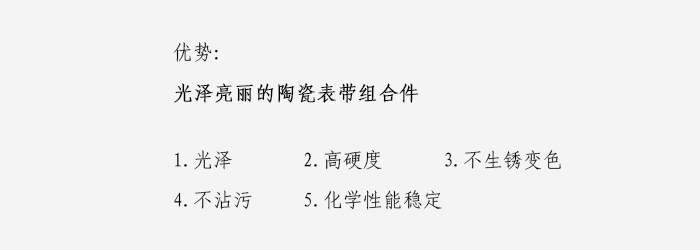 陶瓷手表的重量减轻了大约60%,其硬度约为不锈钢材料的10倍,而且耐锈蚀和耐